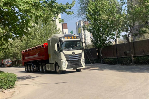 在河北省保定市的街頭,一輛大運(yùn)V9氫燃料牽引車滿載一車沙石從遠(yuǎn)處駛來,此輛車的交付使用代表著大運(yùn)高端...