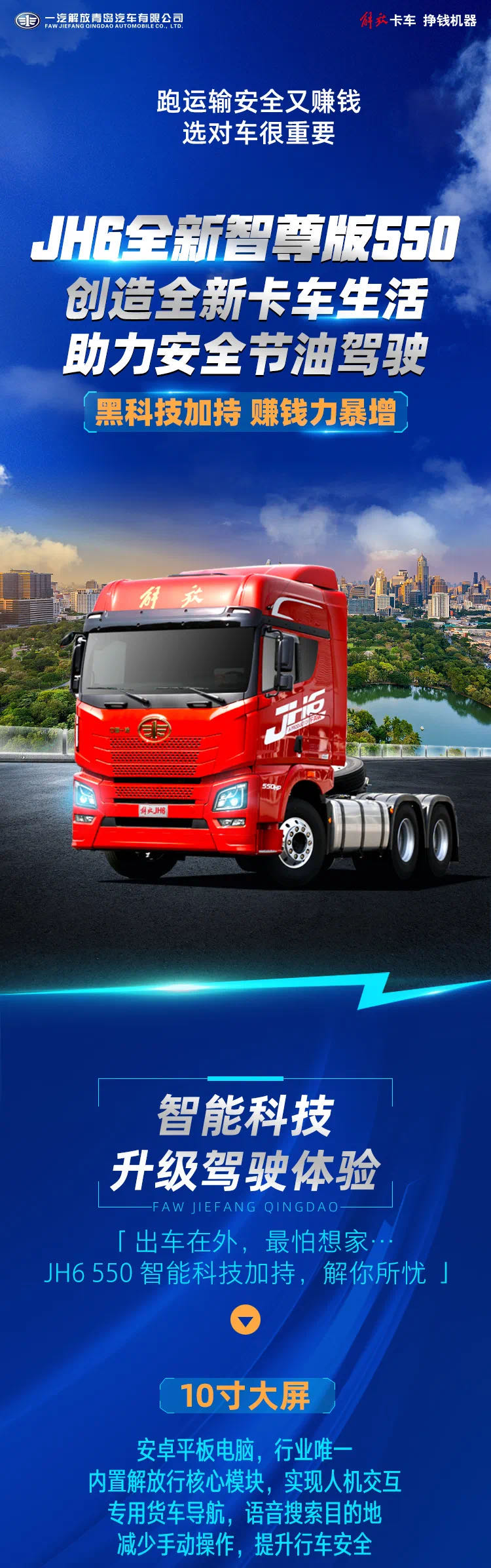 解放青汽JH6全新智尊版550,創(chuàng)造全新卡車生活,助力安全節(jié)油駕駛,有著黑科技的加持,賺錢能力急速暴增。