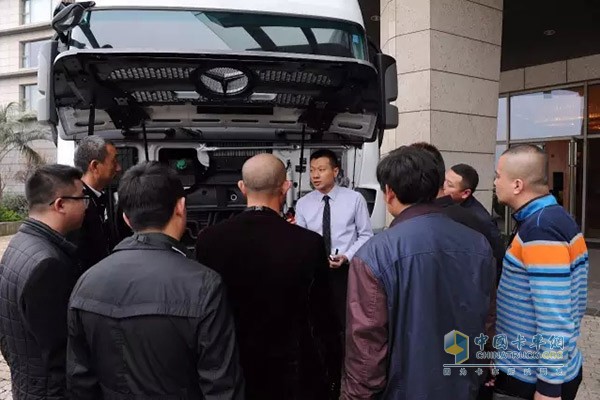 彭杰先生為與會(huì)嘉賓做車輛講解,此次展車為快運(yùn)新星Actros 2646 6×4