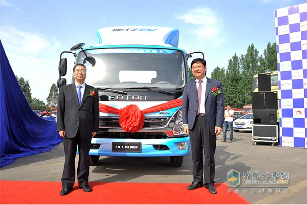 中國物流與采購聯合會副會長蔡進先生與福田商用汽車集團副總裁、輕型商用車業務總監趙建民先生為福田奧鈴EV純電動超級輕卡新品揭幕