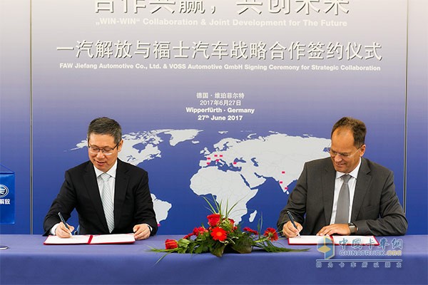 2017年6月27日,一汽解放與福士(VOSS)在德國科隆簽署戰略合作框架協議,開啟全面戰略合作伙伴關系。雙方將在品牌建設、產品研發、市場營銷、技術支持、業務拓展等領域展開深入合作。一汽解放汽車有限公司黨委書記、總經理胡漢杰先生及福士集團CEO Thomas Roethig 博士出席簽約儀式并簽署戰略合作框架協議。