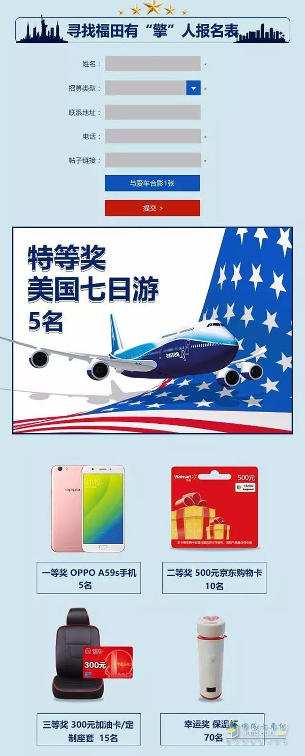 除了美國7日游大獎,企業還為各位福田時代/瑞沃車主們準備了oppo手機、購物卡、加油卡定制座套、美國行紀念保溫杯等豐厚獎品。您只需要將您與福田時代/瑞沃的故事分享到論壇,讓更多車友認識有“擎”的您!
