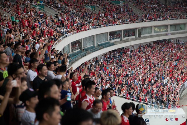 除此之外,曼恩集團還在拜仁慕尼黑與阿森納、AC米蘭對決期間,在比賽現場分別安置兩輛采用拜仁球隊紅藍主色調涂裝的曼恩TGX卡車,為拜仁慕尼黑加油、助威!此次展出的曼恩TGX卡車,是曼恩集團旗下最經典的一款商用車系列,無論是設計理念還是設施配置都達到了最頂峰,在兼顧了安全性、舒適性的情況下還實現了高效、節能、環保的目的。即使面對國內各種復雜多變的道路交通環境都能夠有很好的應對和駕駛體驗。