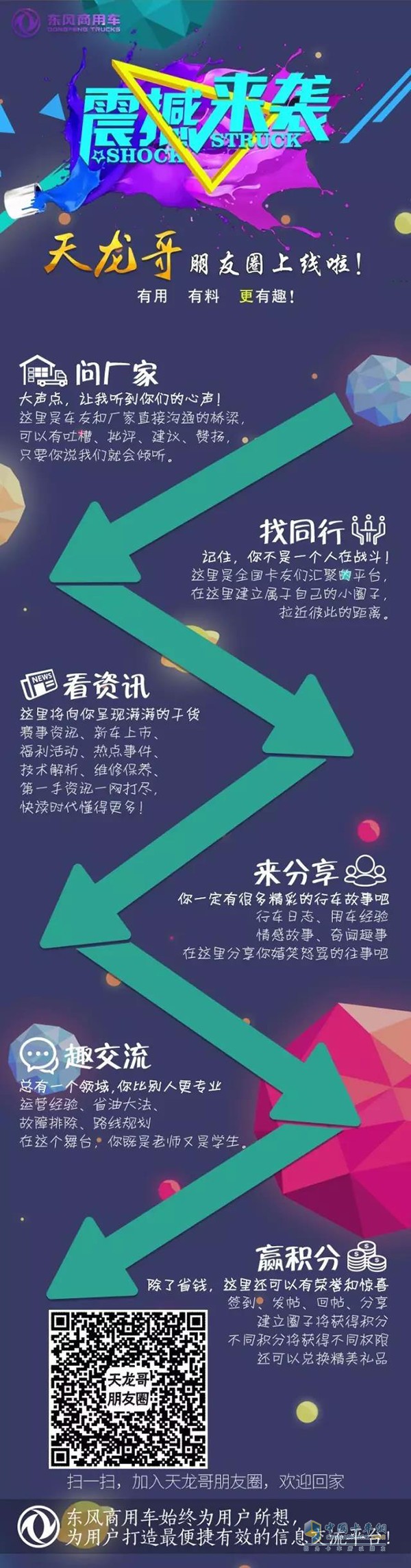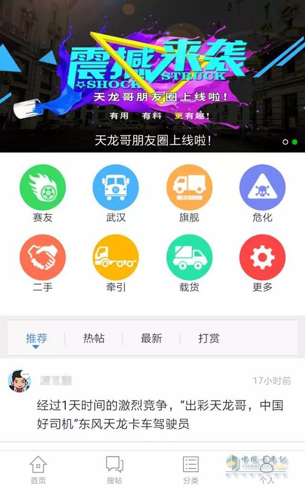 通過(guò)點(diǎn)擊頂部“點(diǎn)擊關(guān)注”掃描彈出來(lái)的二維碼,可直接進(jìn)入東風(fēng)商用車(chē)微信公眾平臺(tái)。在“推薦頻道”劃分有各發(fā)帖區(qū)域,相比于首頁(yè)鏈接,劃分區(qū)域更多,統(tǒng)計(jì)更詳細(xì)。更有獨(dú)特的“創(chuàng)建圈子”功能,創(chuàng)建一個(gè)屬于自己的圈子。