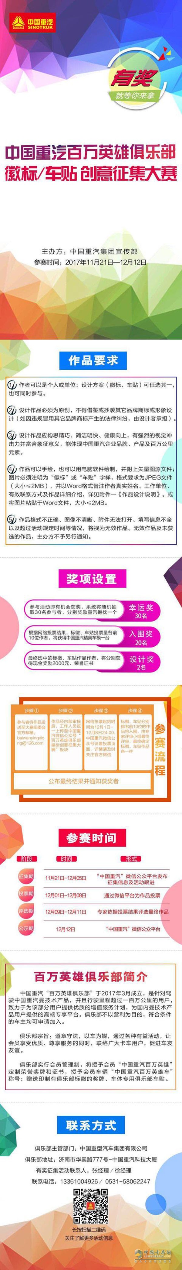 中國重汽百萬英雄俱樂部徽標車貼創意征集大賽火熱征集中,不論您是個體還是單位,只要內容為原創并兼具作品內涵都可以參加活動。活動期間 ,各種大獎驚喜不停歇!具體活動信息如下圖: