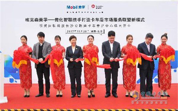2017年11月30日,運(yùn)聯(lián)科技長沙公路港卡車養(yǎng)護(hù)中心盛大開業(yè)。作為養(yǎng)護(hù)中心籌辦方,來自埃克森美孚(中國)投資有限公司、傳化智聯(lián)股份有限公司、傳化運(yùn)聯(lián)科技有限公司與長沙傳化公路港物流有限公司的四方領(lǐng)導(dǎo)共同出席了剪彩儀式,并就共同布局卡車后市場,發(fā)展全新“車后服務(wù)聯(lián)盟”模式進(jìn)行了深入探討。