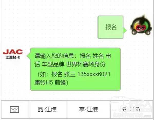 ②按照活動規則,發送消息“報名 姓名 電話 車型品牌 世界杯賽場身份”到【江淮輕卡】公眾號-> 收到系統回復后即為報名成功。
