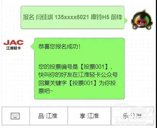 ①發送消息“報名”到【江淮輕卡】公眾號