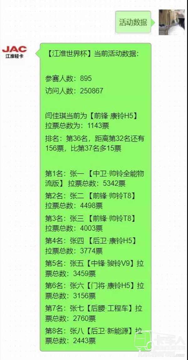 發送參賽者的“投票編號”到【江淮輕卡】公眾號 -> 收到相應系統回復即為投票成功。