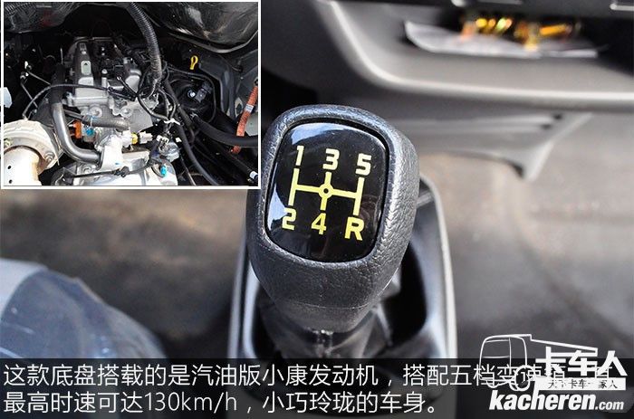 這款底盤搭載的是汽油版小康發動機,搭配五檔變速箱,其最高時速可達130km/h,小巧玲瓏的車身,可隨意穿梭城鎮市區,非常適合短途的貨物運輸。
