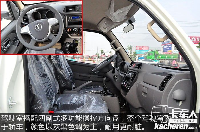 駕駛室搭配四副式多功能操控方向盤,整個駕駛室內飾類似于轎車,顏色以灰黑色調為主,耐用更耐臟。