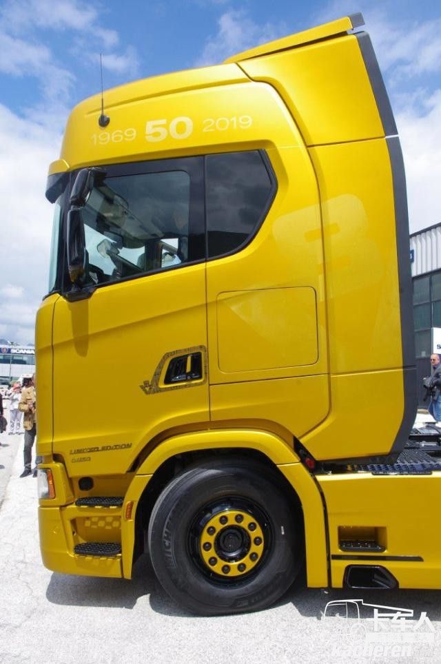 除了裙板帶有V8標識外,驅動橋軸頭處也帶有同樣的標識。輪轂采用啞光黑色,與裙板、擋泥板的金色遙相呼應。每個細節都彰顯著斯堪尼亞對V8發動機歷史的回眸以及對未來的新展望。