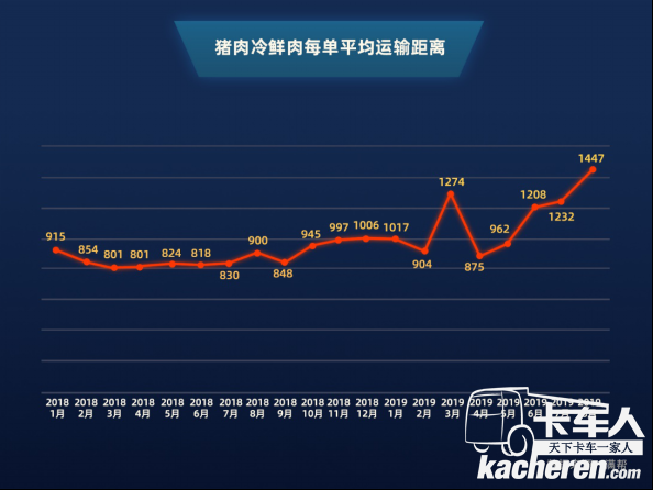 在“調(diào)豬”變“調(diào)肉”的政策建議下,一年來豬肉冷鮮肉貨運(yùn)量漲勢明顯。2019年8月,豬肉冷鮮肉貨運(yùn)量同比增長10倍,且平均運(yùn)輸距離變得更長。一年時(shí)間,冷鮮肉每單平均運(yùn)輸距離從900公里提升到1447公里,同比提升60.7%。