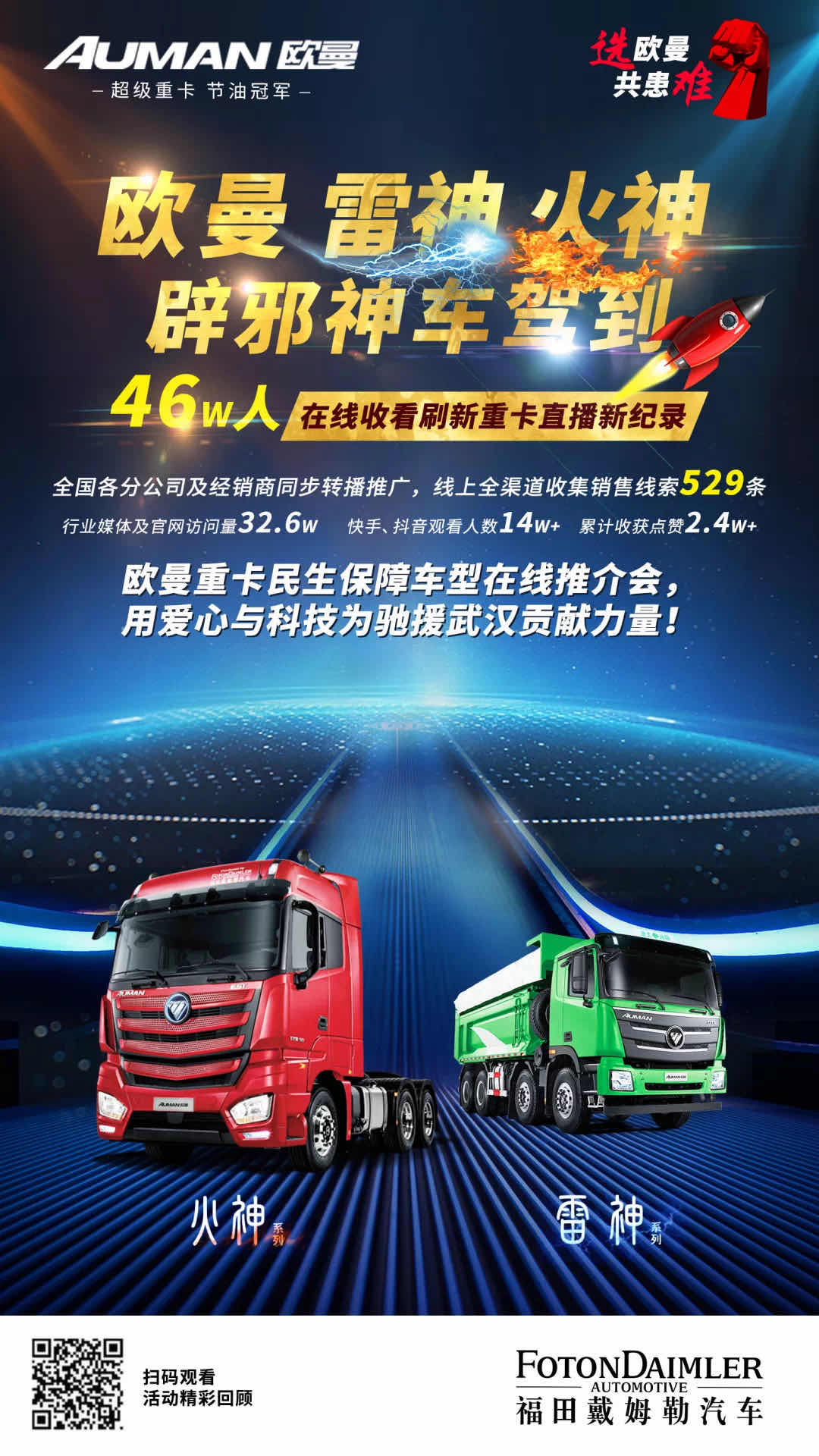 2月6日,福田戴姆勒汽車通過舉辦主題為“選歐曼 共患難”的民生保障車型在線推介會,為疫情期間意向購買民生保障類車型的客戶,結合具體行業(yè)及使用工況進行專屬的車輛選擇指導,并提供購車暖心包、金融支持、人身保險等專屬優(yōu)惠政策,想卡友所想,解卡友之憂,眾志成城抗疫情。最終,累計有超過46萬卡友線上收看了直播,累計收獲點贊超過2.4萬,線上全渠道收集銷售線索529條,刷新重卡在線直播新紀錄。