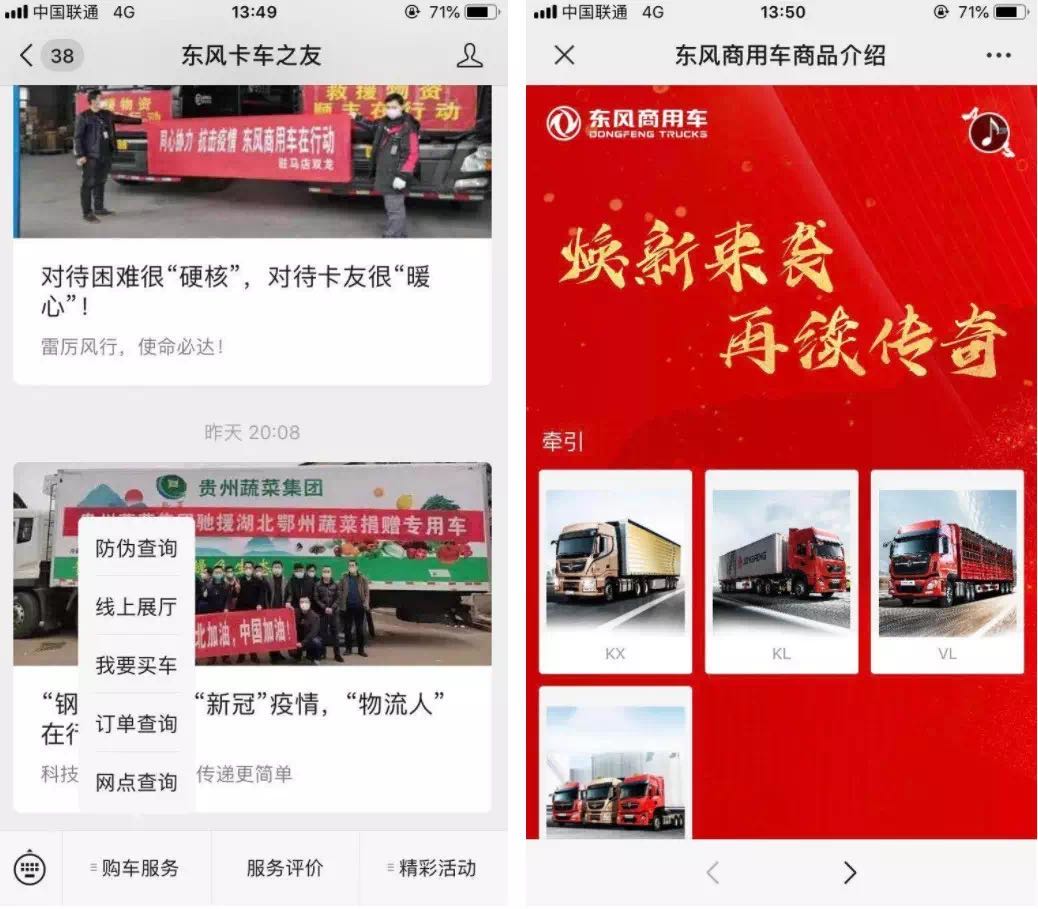 進入方式:進入東風卡車之友官方訂閱號,在底部菜單“購車服務”選擇“線上展廳”,即可線上看車選車。