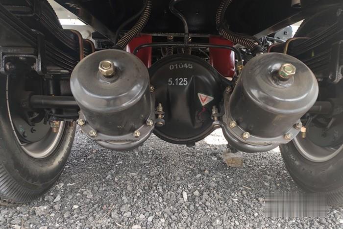 裝在130重載后橋,6.00-15輪胎,采用雙頂結構,具有升降速度快、平衡性好的優點。底盤采用專用車全鉚接底盤,板簧外掛結構,承載能力更強,底盤低
