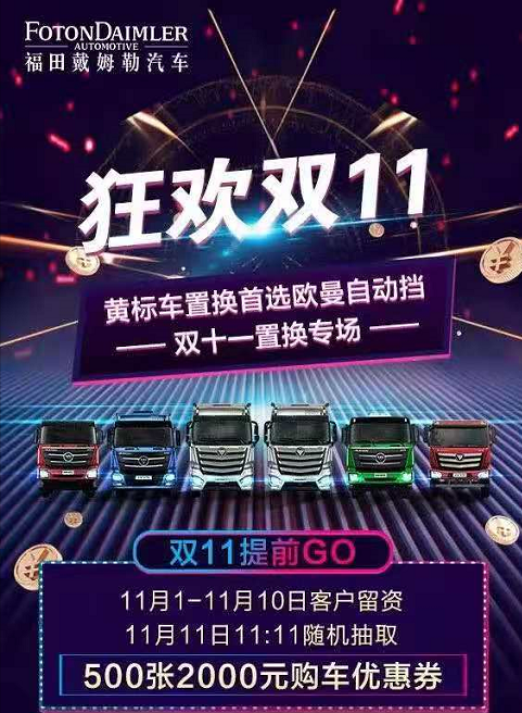 2020年雙十一期間,福田戴姆勒汽車推出“狂歡雙十一,黃標車置換首選歐曼自動擋-雙十一置換專場”,11月1-11月10日客戶留資,11月11日11:11隨機抽取,500張2000元購車優惠券,總價值100萬元的購車優惠券將分享給卡車人朋友。
