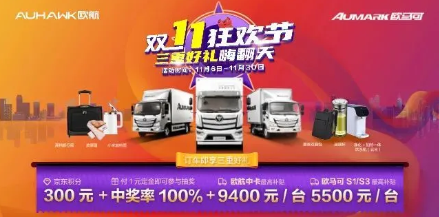 “雙十一”狂歡節 歐航歐馬可線上下單享專屬優惠,三重好禮嗨翻天!一重禮:訂車享300元京東積分;二重禮:付一元訂金即可參與抽獎,中獎率100%;三重禮:享受專屬購車補貼,歐航中卡最高補貼9400元/臺,歐馬可S1/S3最高補貼5500元/臺。