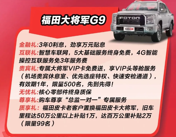 福田皮卡雙十一六重大禮:金融禮、互聯禮、貴賓禮、無憂禮、尊享禮、質享禮。