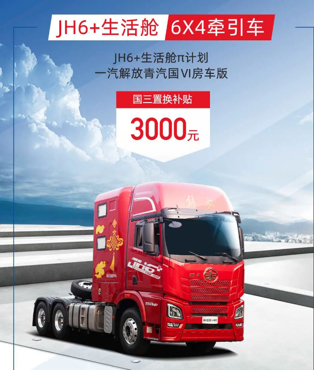 國三卡車置換一汽解放青汽國VI房車版,卓越版補貼3000元/臺。