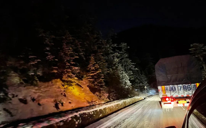 雖然相關部門快速出動了鏟雪車,但殘留下來的一層雪被通過的車輛碾壓,在路面形成了堅硬的冰層,路況依舊十分惡劣。在放行后,2號、3號和4號車依靠整車性能和駕駛員的豐富經(jīng)驗,緩慢通過了該路段,但斷后的1號車卻因為自身裝配的輪胎不適應冰雪路面,導致車輛在半坡打滑被困。