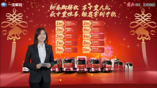 一汽解放汽車銷售有限公司客戶開發維護部部長王睿女士為直播間的卡友朋友們、解放的粉絲們帶來了豐厚的十重購車豪禮,以及在2021年1月1日元旦全天均可參與的解放云店認籌活動。