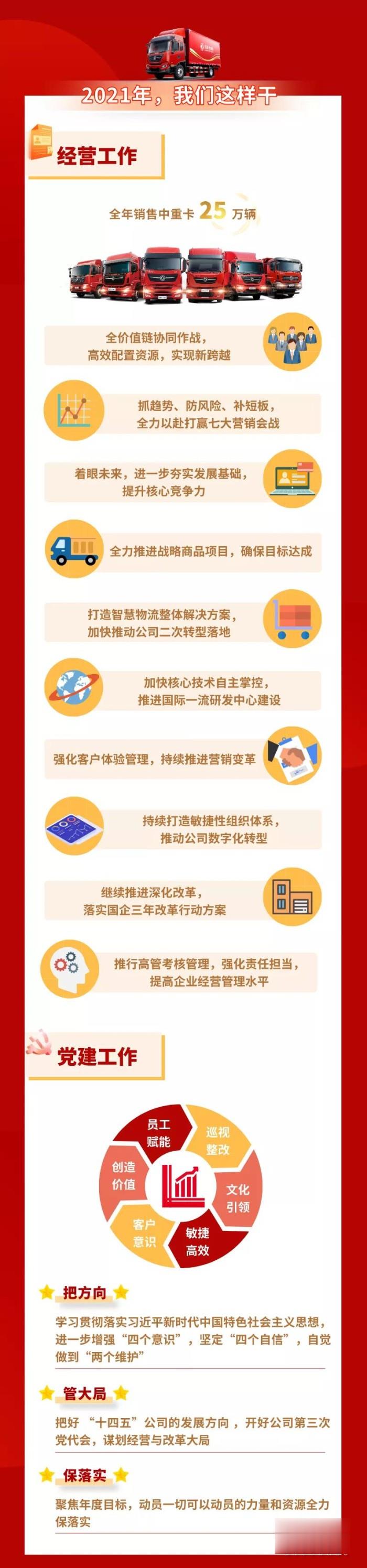 楊青說,2020年,東風(fēng)商用車一手抓疫情防控一手抓復(fù)工復(fù)產(chǎn),在集團(tuán)內(nèi)率先提出“目標(biāo)不變、壓力不減”,全力達(dá)成年度目標(biāo)。這一切的背后,是東風(fēng)商用車兩級黨委的組織帶領(lǐng),是全體干部員工上下一心,體現(xiàn)了強(qiáng)有力的組織力、戰(zhàn)斗力和保障力。針對2021年工作,楊青要求,東風(fēng)商用車高管隊伍要保持狼性,必須具備敢于挑戰(zhàn)的能力、對市場敏銳的觀察能力、快速反應(yīng)能力、果敢的執(zhí)行能力等四項(xiàng)重要能力;黨員隊伍要真正發(fā)揮好模范帶頭作用,真正做到“別人不愿干的我去干,別人干不好的我干好”;要重視各項(xiàng)資源的調(diào)配利用,重視對基礎(chǔ)技術(shù)的研究和基礎(chǔ)資源的掌握,特別是核心技術(shù)的掌握,打破資源瓶頸,突破卡脖子技術(shù),戰(zhàn)勝前進(jìn)路上的各種攔路虎,全力確保各項(xiàng)目標(biāo)的達(dá)成。