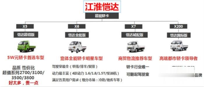 “作為中國中高端轎卡領軍品牌,江淮愷達自誕生之日,便把‘五大超越、五大全能’立為愷達品牌DNA,為此針對每個細分市場研發了高性能的產品和最佳的物流解決方案。在江淮愷達的產品型譜中,包含X5、X6、X7、X200四大產品系。X5定位5萬元級高品質、高性價比首選車型;X6定位同級別寬體全能轎卡明星產品;X7定位商貿物流市場,是轎卡行業內唯一可翻起駕駛室的轎卡車型;X200定位高端都市轎卡領導者,重點布局國際市場。”