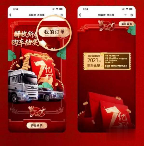 眾多喜愛解放卡車的車友們隨手一點,便將驚喜大獎收入囊中。更有幸運兒牛運亨通,左手享鉅惠購解放,右手行大運抽紅旗,據悉,有兩位幸運車主將“特等獎”紅旗HS5轎車免費開回家。“7億抽獎”的中獎名單現已火熱出爐,詳情已在 “解放卡車”官方微信號上進行權威公示,卡友也可點擊“解放新春送7億購車抽獎贏紅旗”官方界面,通過【我的訂單】查看中獎情況,快來看看是誰抽了紅旗車,誰中了萬元禮券吧!(同時,千萬記得在有效期內使用獎券哦,購車30輛以下獎券使用期限是2021年4月30日前;購車30輛以上獎券使用期限是2021年5月31日前。)
