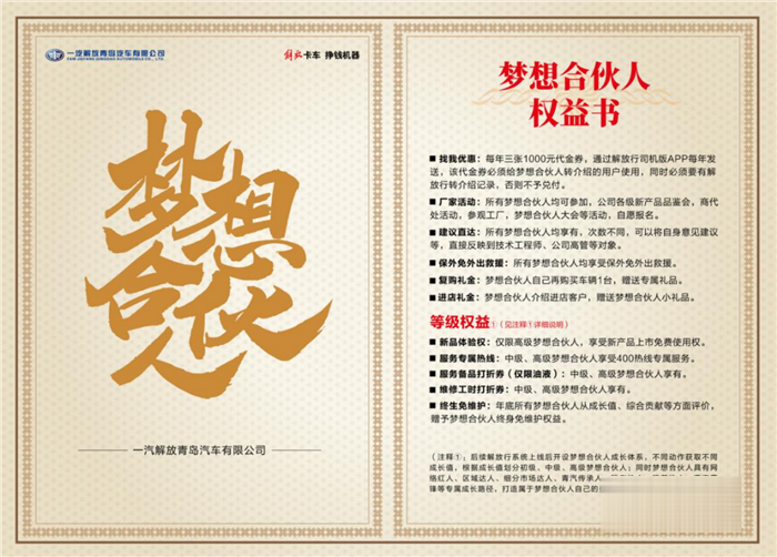 2021年,解放青汽開啟"夢想合伙人"計劃,馮先生受邀加入,成為首批名人堂成員,從此可享各項專享權益福利,"這是一份榮譽,對于軍人而言,榮譽感非常重要",馮先生說:"企業信任我,卡友們也信任我,因此我會更加努力,幫助更多卡友。勿以善小而不為,從身邊的點滴入手,讓我們大家庭中的每個人感受到溫暖和關愛。"