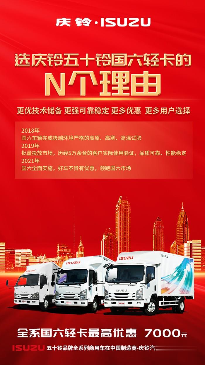 為回饋廣大消費(fèi)者的信賴與支持,慶鈴汽車還推出了國六全系車型最高優(yōu)惠7000元的大禮,讓更多用戶使用世界水準(zhǔn)的商用車。