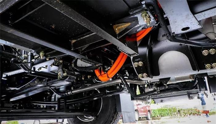 在傳動系統(tǒng)方面,搭載法士特6E240電動重卡專用自動變速箱,后橋為457后橋,速比為4.875。