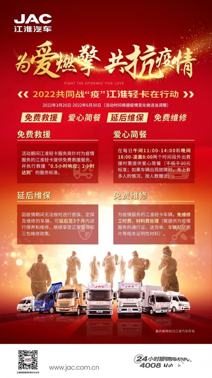 這次春季疫情反撲,全國各地都出現較多新增病例,鑒于此江淮輕卡迅速響應,繼續開展為愛燃擎共抗疫情系列大型援助行動,針對高風險地區,江淮輕卡免費救援、免費愛心簡餐、免費維修等服務將持續開展,另外疫情期間需要保養的用戶,可申請延后維保,保障卡友權益不受任何損失。