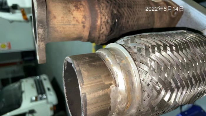 原來,由于長時間高強度行駛,車輛排氣管位置的軟管出現了破損導致漏氣。服務站救援人員準備好相關配件和工具后立刻駕車趕往報修點,駕車途中發現核酸檢測證明快過期限,很有可能在救援后無法返回南通市。但保障抗疫物資運輸情況緊急,已經顧不上許多,盡快修好運輸車是首要任務。