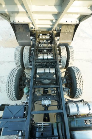 很多卡友在工程運輸中常常會碰到重載起步難、爬坡難的問題,動力不足占很大原因。瑞沃金剛炮(6x2懸浮橋)全系搭載玉柴YCK05240-60發動機,排量為5.13L,滿足國六的排放標準,最大動力輸出240馬力,在1200-1600轉速區間就可以爆發900N.m的峰值扭矩,爬坡脫困性能優越,滿足工程車重載工程運輸需要,同時搭配法士特十檔變速箱,頭擋速比12.09,最高擋速比0.78。大傳動比讓車輛爬坡能力更強,輕松應對各種復雜的工況。底盤方面,這款車搭載的是457的重載后橋,速比為5.833,板簧方面采用10/7/12+9形式的多片簧設計,這一系列為重載而設計,讓金剛炮的承載能力顯著提升。