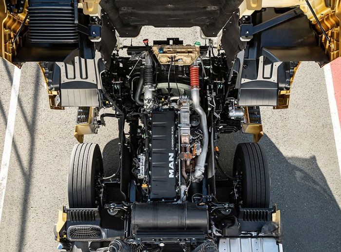 發(fā)動(dòng)機(jī)匹配了MAN TipMatic® 12 26 DD手自一體變速箱,12個(gè)前進(jìn)擋,2個(gè)倒擋,帶空擋滑行功能。