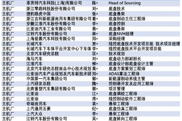 路特斯、蔚來、吉利、重汽、上汽商用車、華人運通、雷達、江鈴、賽力斯、理想、捷豹路虎、內蒙一機、一汽紅旗、中國一汽、合眾、北汽福田、中車四方、豐田、泛亞、鄭州日產、上汽乘用車、博世、采埃孚、安波福、博世華域、經緯恒潤、海拉、舍弗勒、蒂森克虜伯、京西重工、日立安斯泰莫汽車系統、清車智行、 浙江世寶、捷太格特、重慶耐世特、聯創電子、ADVICS、 萬都、Brembo、NISSIN、力邦合信、蜂巢智能、蕪湖伯特利、拓普集團、萬安科技、英創智匯、順達汽車飾件、奧托立夫、延鋒汽車、均勝電子、冠潤汽車、弗迪科技、 恒隆汽車、萬達汽車、豫北轉向系統、德爾汽車部件、利氪科技、博澤電機、德昌電機、方正電機、三菱電機、飛達利恩精密制造、恩匍樂電子、威巴克、孔輝科技、AMK、中鼎股份、阿爾卑斯、拿森電子、保隆科技、赫爾思曼、摩登、山東重工、悠跑、比博斯特、同馭、瀚德萬安、菲格、格陸博、曙光、千顧、大陸泰密克、大陸、常州中車、華伍、嘉琪、中車戚墅堰、中國公路車輛機械公司、九隆、法士特、萬向錢潮、威伯科、裕克施樂、埃梯梯、依工、豐越、勝脈、華陽、泰科、奧興嘉、理文、福可吉、銀澤、迪庫盛、賓科、天津大學、飛鼎、瑞晟、萬洲、博海、瑞迪、卓宇、勃肯、巴斯夫、沃鐳、中科摩通、利捷得、儒拉瑪特、晟創、中機試驗、林科