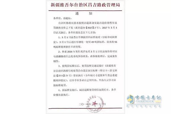 新疆維吾爾自治區路政局應國家治超新規定,3月1日起貨車開始統一使用限重49噸,原來的55噸標準處理軟件不再使用。限重49噸后,超載超限不再從輕處罰。