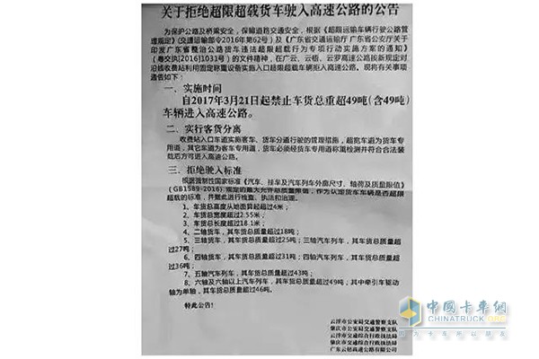 近期,廣東省云浮市、肇慶市交警支隊發布《關于拒絕超限超載貨車駛入高速公路的公告》,廣云、云梧、云羅高速公路沿線收費站入口將利用固定設備對貨車稱重,2017年3月21日起,車貨總重超49噸(含49噸)車輛禁止進入高速公路。