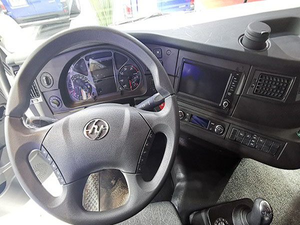 來到主駕駛位置一顆DMS疲勞駕駛預警系統攝像頭也格外顯眼,掛車尾部的滅火器實用而方便。