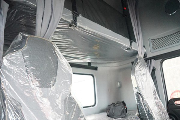 內飾上,采用了轎車化的儀表盤和極具科技感中控臺;主駕座椅采用了可多向調節的氣囊減震座椅,平地板的駕駛室采用四點氣囊減震,能減緩長途駕駛帶來的疲勞,呵護駕駛員健康;改善地毯、隔熱毯、縱向隔音板及內上擋泥板材料,高速行駛室內噪音降至70dB,打電話、說話聊天再也不用“吼”了;高頂雙臥的設計搭配360°窗簾,保證了長途旅程里的休息質量,如同回到溫暖的家。